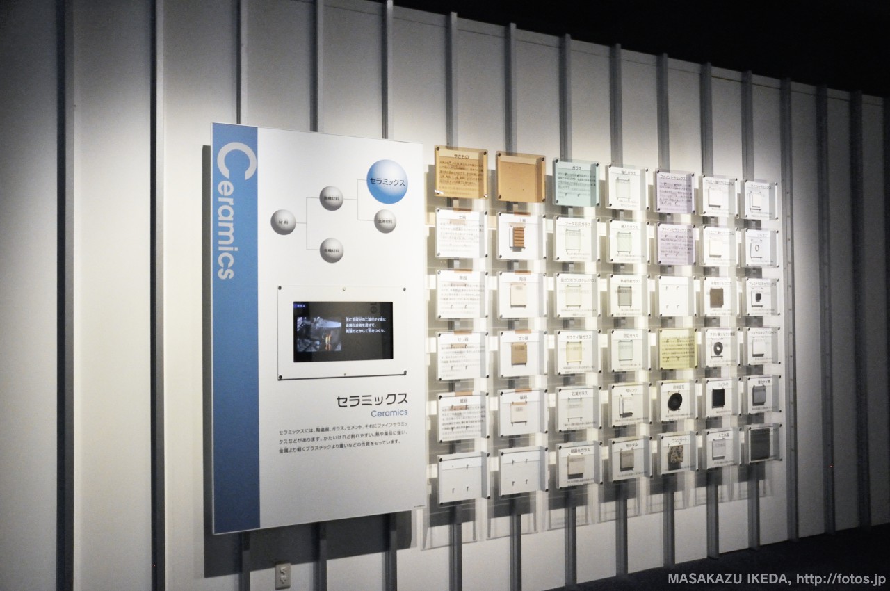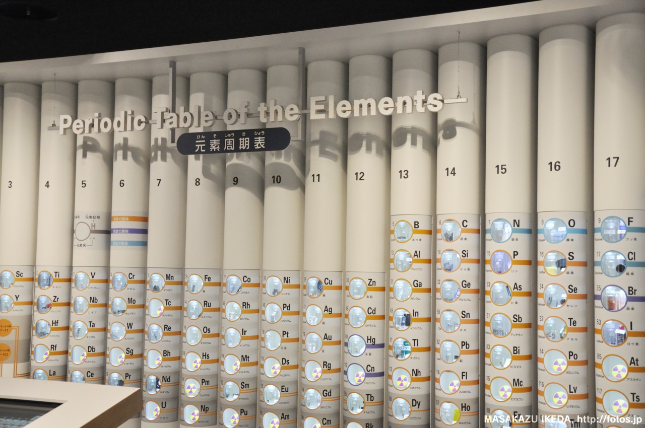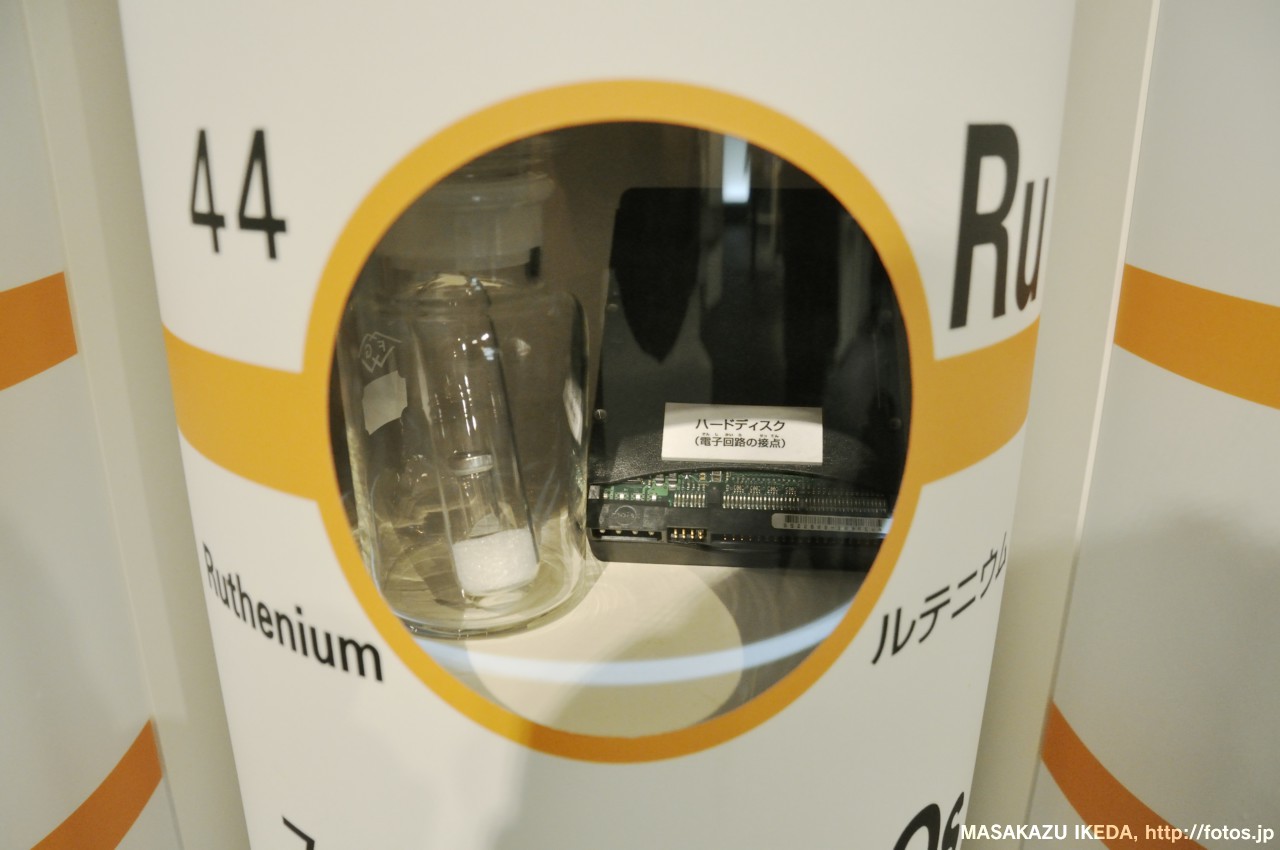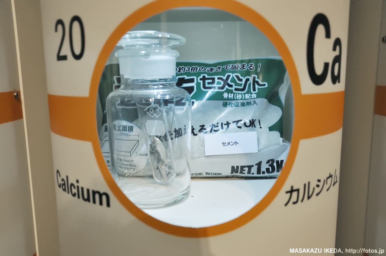 カルシウムCaだったら、セメント。元素名だけでなく、利用されてる製品も実際にみるとより身近になったり、連想記憶できたりで、より覚えやすいと思うし、素敵な展示方法だと思いました。